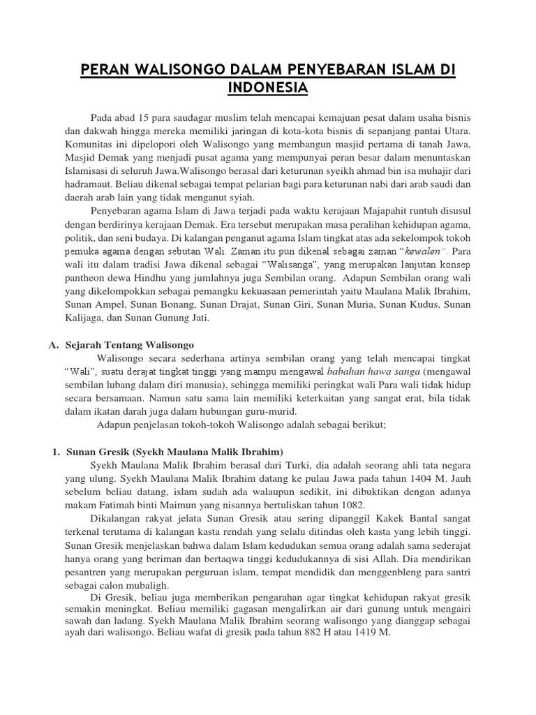 Makalah perananan wali songo dan islamisasi di indonesia. Sejarah wali songo · 1) sunan gresik. Berdasarkan catatan sejarah wali songo, sunan gresik merupakan keturunan nabi muhammad saw ke 22. Telah mengalami pergulatan sejarah cukup panjang. Lahir di samarkand, asia tengah, sunan gresik mempunyai tiga orang isteri. Beliau pertama kali memulai menyebarkan luaskan agama islam di . Adapun yang termasuk wali songo adalah sebagai berikut. Sunan ampel atau raden rahmat. Augmented reality dengan sejarah wali songo sebagai media pembelajaran. Mereka adalah catatan sejarah penting bagaimana perjuangan . Sunan gresik banyak dianggap sebagai wali yang pertama kali . Maka dari itu penulis ingin mengimplementasikan teknologi. Keberadaan sunan gresik ini menjadi kontroversi.